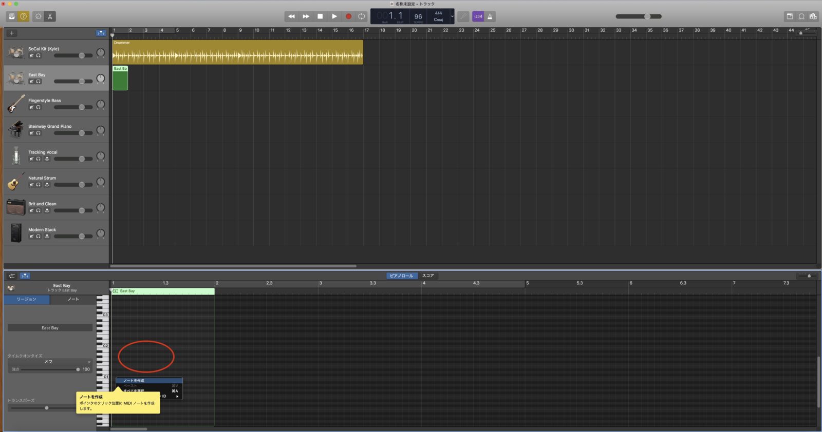 - 赤丸部分で右クリックして、空のMIDIリージョンを作成を選択する。